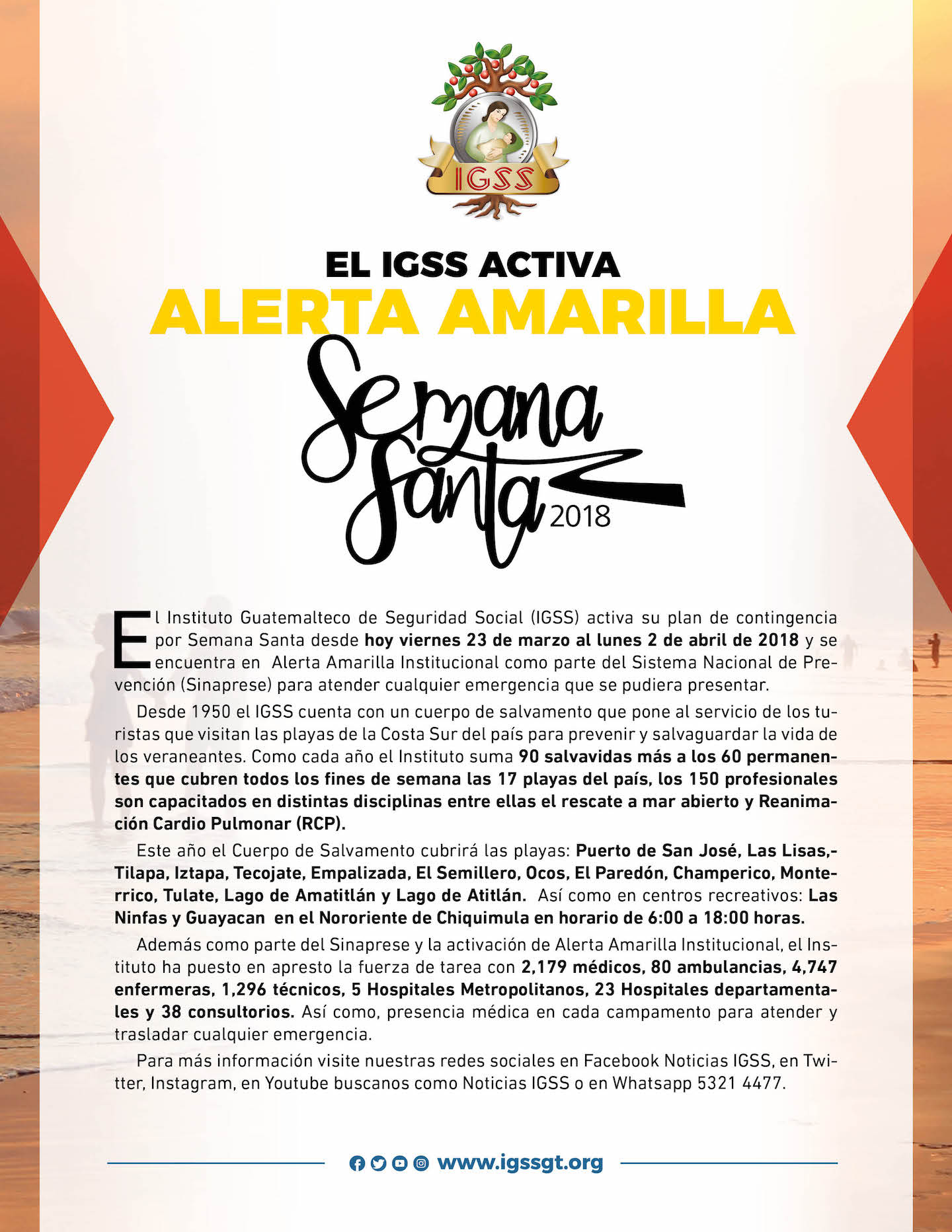 El Instituto Guatemalteco de Seguridad Social activa Alerta Amarilla en todas las unidades médicas del país del 23 de marzo al 2 de abril de 2018 como parte del Sistema Nacional de Prevención (Sinaprese) Semana Santa 2018.