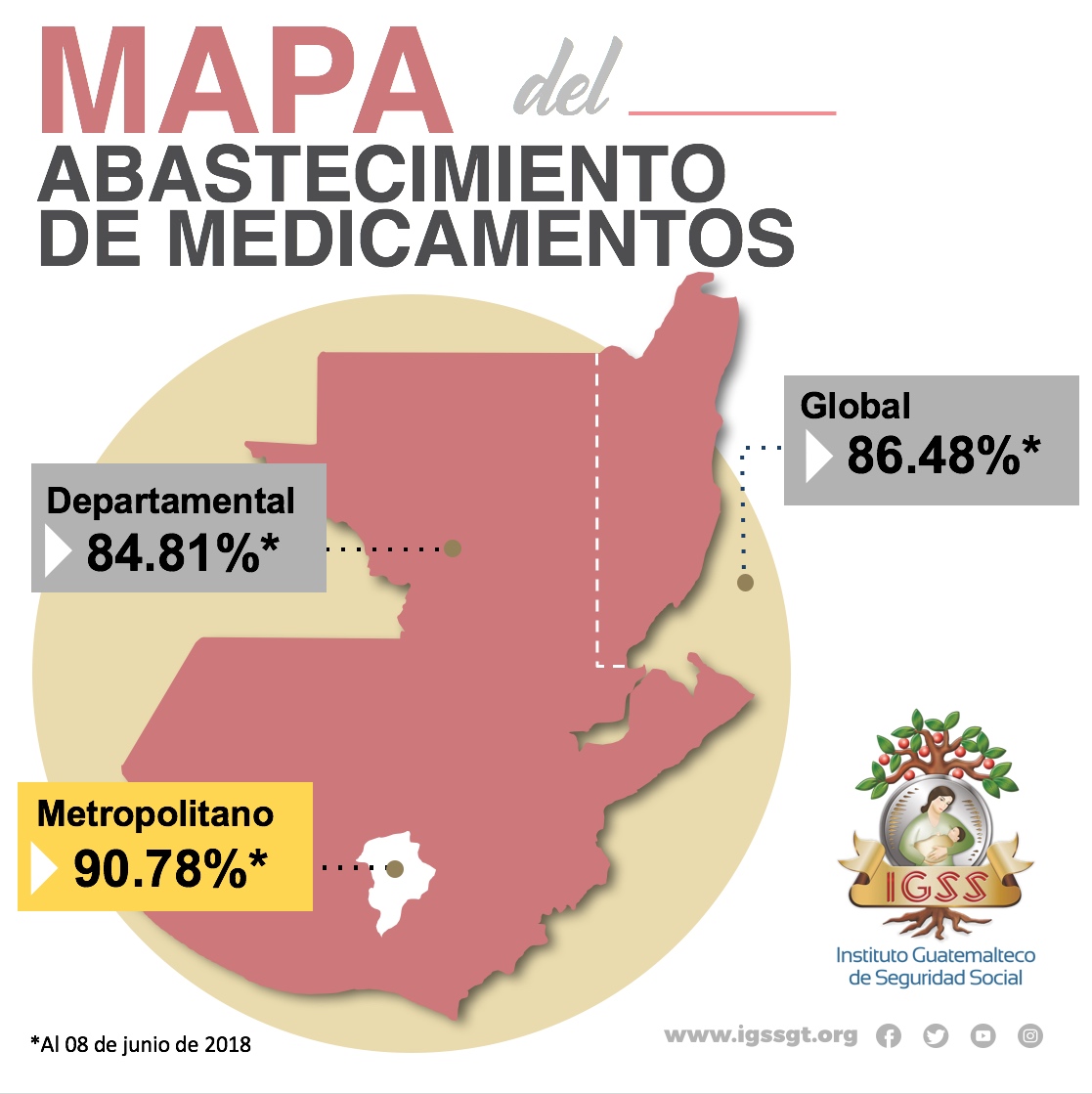 Mapa del abastecimiento de medicamentos al 08 de junio de 2018 8 junio, 2018 TwitterWhatsAppLinkedin Situación de abastecimiento de medicamentos al 08 de junio de 2018 en nuestras unidades médicas #IGSS del área metropolitana y departamental. Abastecimiento global: 86.48% Abastecimiento departamental: 84.81% Abastecimiento metropolitano: 90.78%