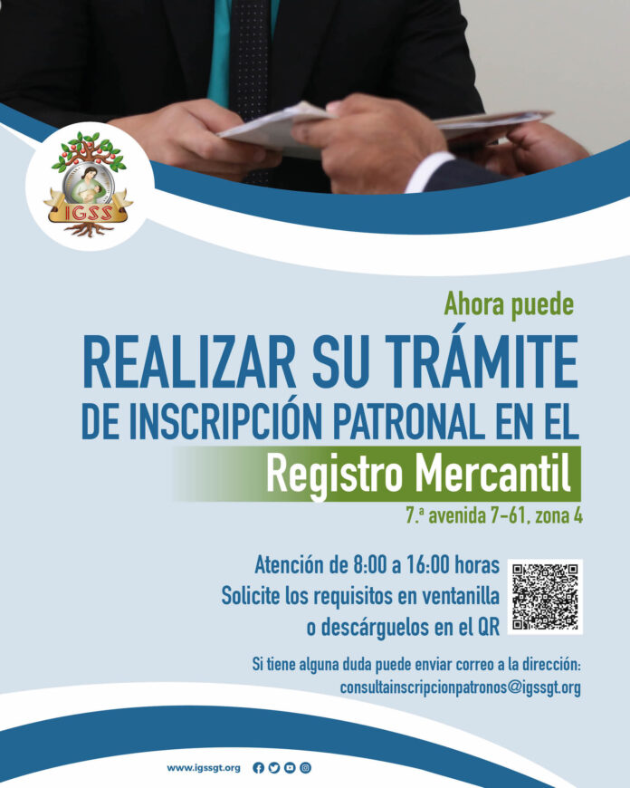 Más información a través de los correos electrónicos sergio.jerez@igssgt.org, luis.uselo@igssgt.org, jeffrey.alvarez@igssgt.org, nora.castro@igssgt.org, consultainscripcionpatronos@igssgt.org o comunicándose al teléfono 2412-1340