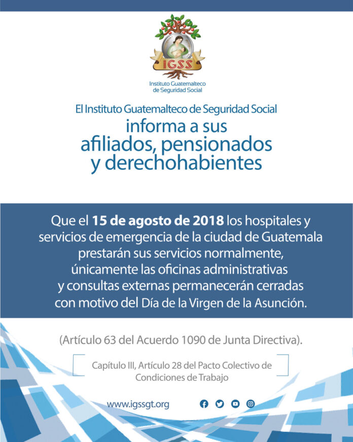 El Instituto Guatemalteco de Seguridad Social informa a sus afiliados, pensionados y derechos habientes que el 15 de agosto de 2018 los hospitales y servicios de emergencia de la ciudad de Guatemala prestarán su servicio normalmente, únicamente las oficinas administrativas y consultas externas permanecerán cerradas con motivo del Día de la Virgen de la Asunción.