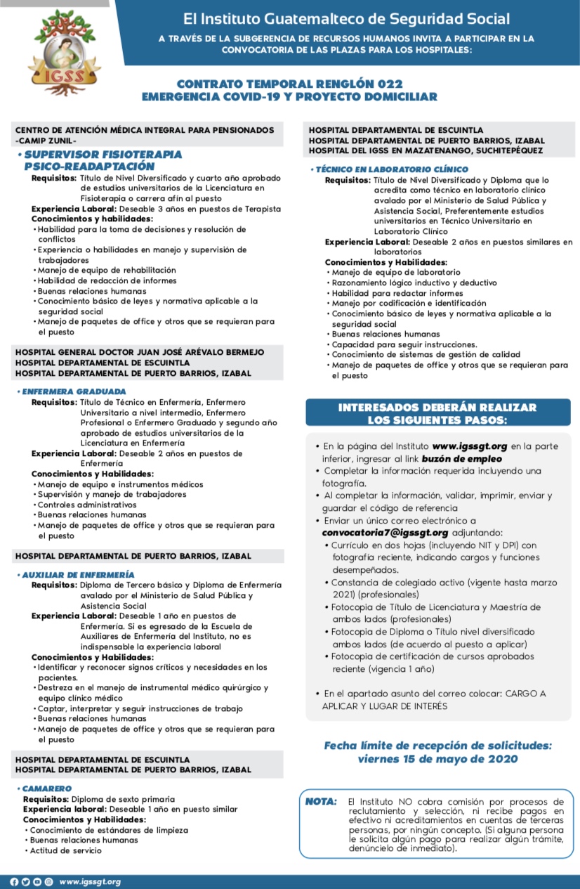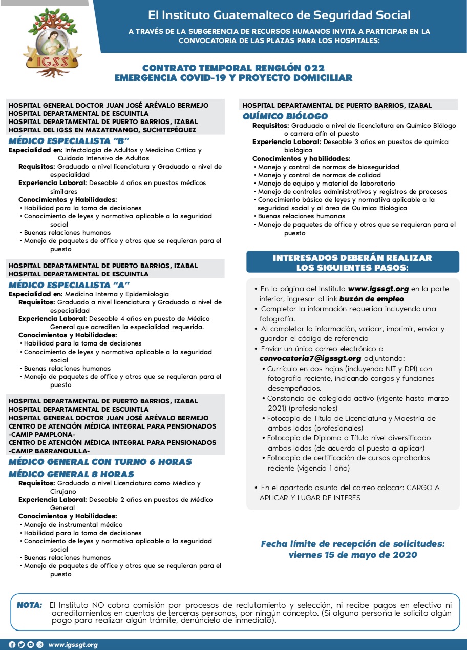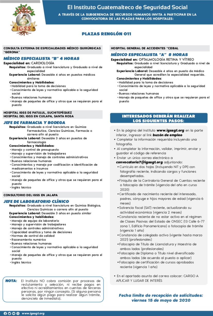 El Instituto Guatemalteco de Seguridad Social a través de la Subgerencia de Recursos Humanos invita a participar en la convocatoria de las plazas para sus hospitales:
