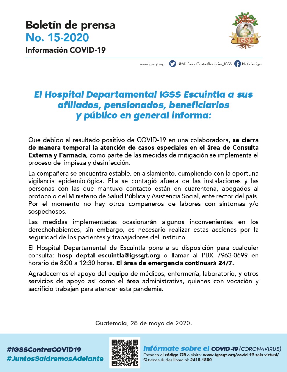 Boletín de Prensa No. 15-2020 El Hospital Departamental IGSS Escuintla a sus afiliados, pensionados, beneficiarios y público en general informa: 28 mayo, 2020 TwitterWhatsAppLinkedin