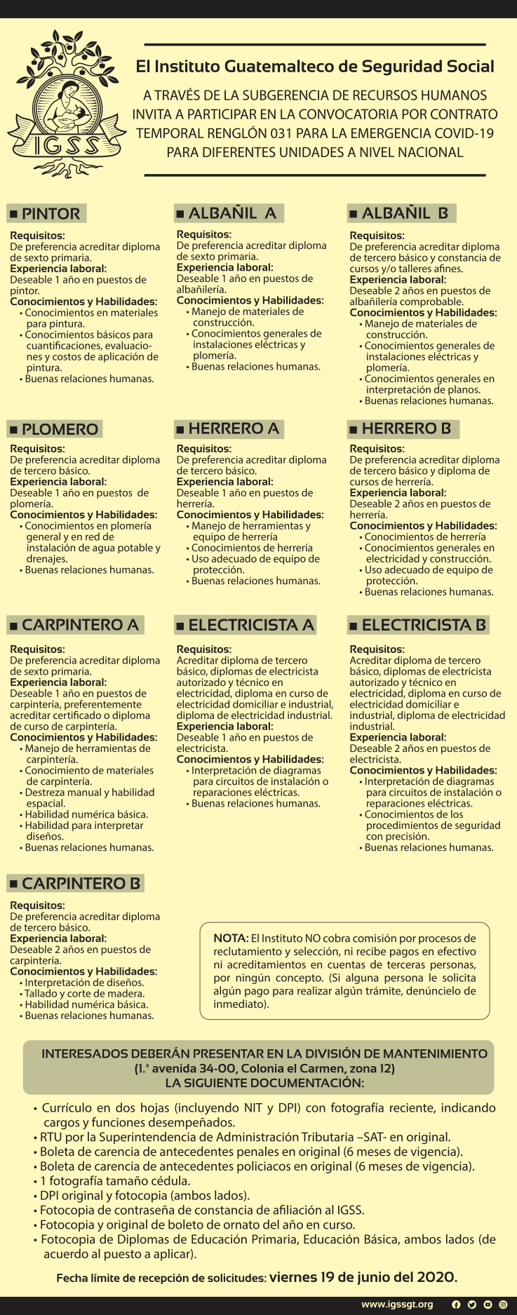 También tienen abierta la plaza para “Dietista” y otra para un “Encargado de Mantenimiento A”, ambas para el Hospital General de Enfermedades. El IGSS recibirá papelería hasta el 9 de junio para aplicar a estas plazas.