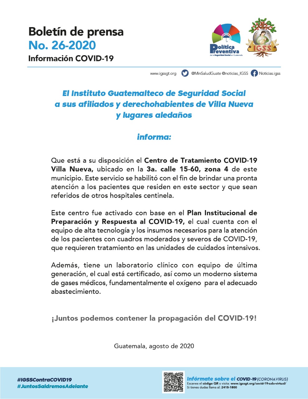 Boletín de Prensa No. 26-2020 El IGSS a sus afiliados y derechohabientes de Villa Nueva y lugares aledaños informa: 21 agosto, 2020 TwitterWhatsAppLinkedin