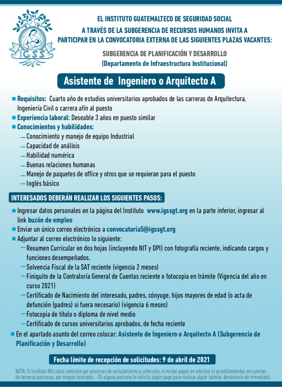 - Asistente de Ingeniero o Arquitecto A (Departamento de Infraestructura Institucional/Subgerencia de Planificación y Desarrollo)