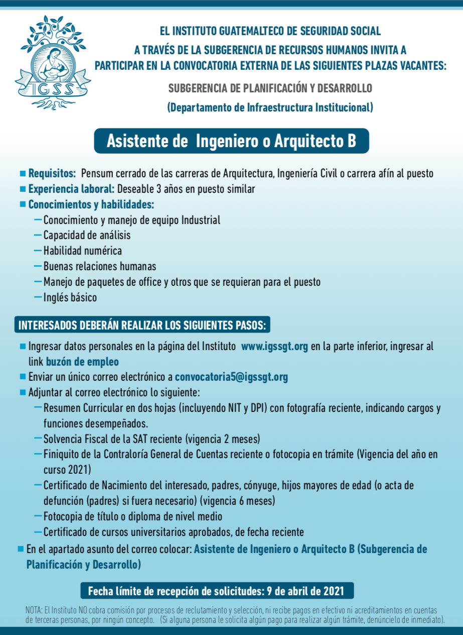 - Asistente de Ingeniero o Arquitecto B (Departamento de Infraestructura Institucional/Subgerencia de Planificación y Desarrollo)