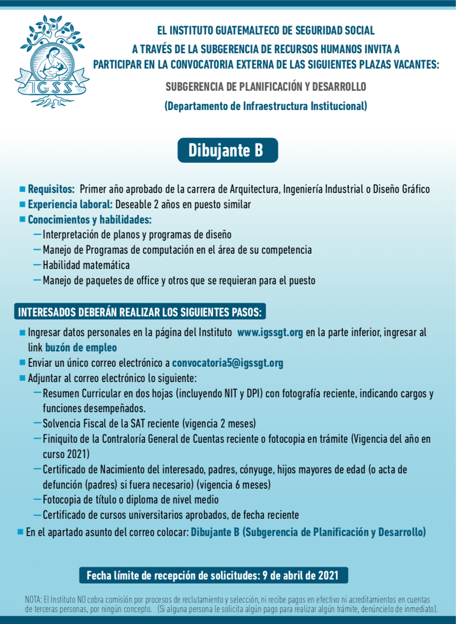 - Dibujante B (Departamento de Infraestructura Institucional/Subgerencia de Planificación y Desarrollo)