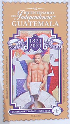 En un acto emotivo y simbólico realizado este lunes, el licenciado José David Prado Vásquez, director general de Correos y Telégrafos de Guatemala, entregó a las máximas autoridades del IGSS una carpeta con los diseños de los sellos postales del Bicentenario de Independencia. En uno de ellos se plasma el monumento al trabajo y en el fondo la imagen del mural la Seguridad Social, obra del artista Carlos Mérida, el cual engalana el edificio de las Oficinas Centrales del Instituto Guatemalteco de Seguridad Social (IGSS).