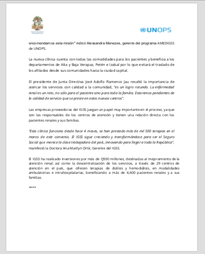 «Es muy satisfactorio ver cómo evolucionan los pacientes que hacen uso de los nuevos servicios de hemodiálisis para pacientes crónicos del Seguro Social, gracias al IGSS por encomendarnos esta misión» indicó Alessandra Menezes, gerente del programa AMEDIGSS de UNOPS.