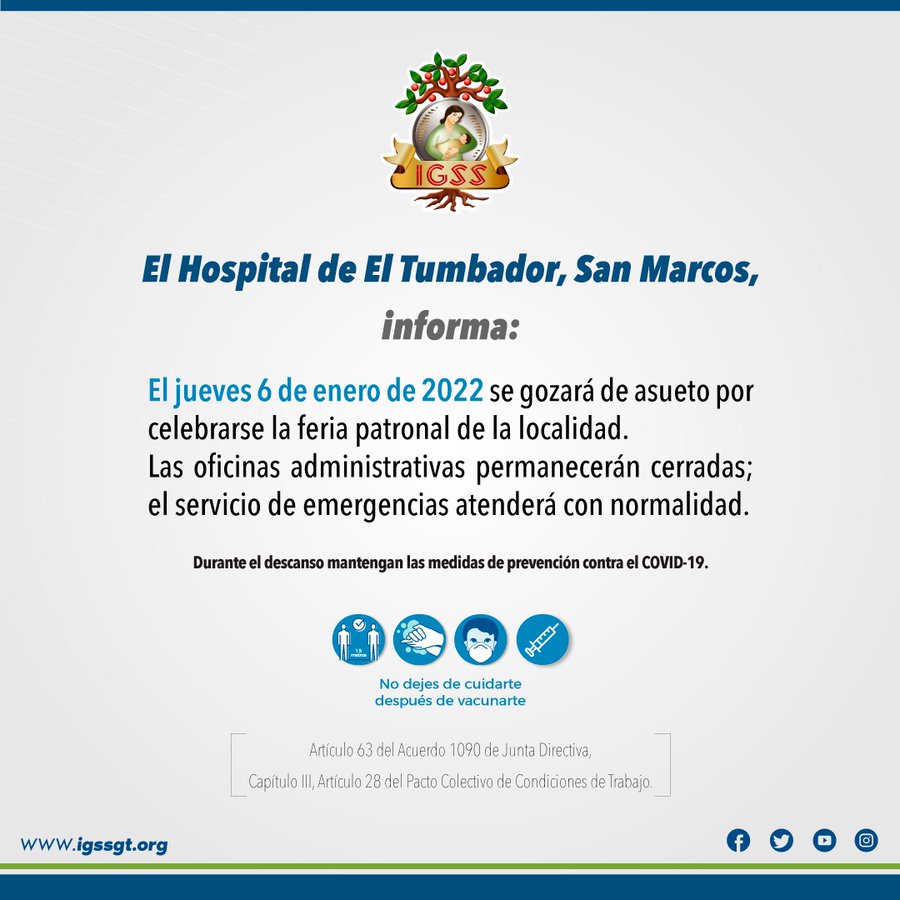 Aviso. El Hospital de El Tumbador, San Marcos, informa: 5 enero, 2022 TwitterWhatsAppLinkedin El Hospital de El Tumbador, San Marcos, informa que el jueves 6 de enero se gozará de asueto por celebrarse la feria patronal de la localidad.