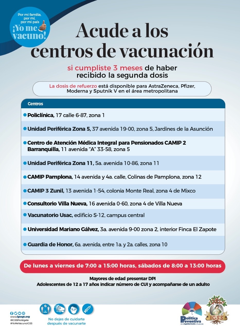 Para los afiliados o no al #IGSS está disponible la dosis de refuerzo en los centros de vacunación del Instituto en el área metropolitana al cumplir 3 meses de haber recibido la 2a. dosis.