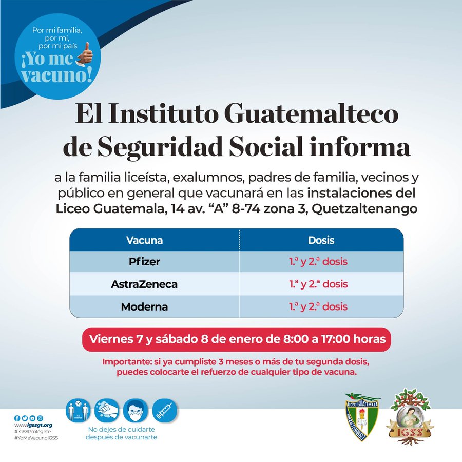 El viernes 7 y sábado 8 de enero, en las instalaciones del Liceo Guatemala de Xela, una brigada del Hospital General de Quetzaltenango estará vacunando contra el COVID-19 a población en general.