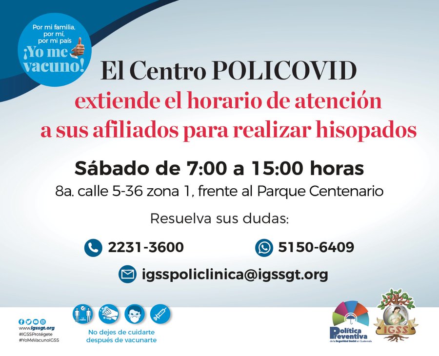 El Centro POLICOVID del IGSS, ubicado en zona 1 de la ciudad capital, informa sobre la ampliación de horarios los sábados para realizar la prueba de detección de Covid-19.