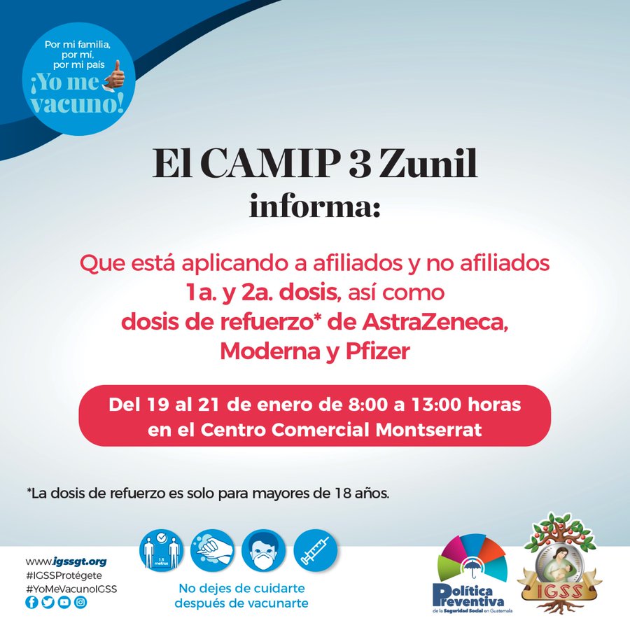 Aviso. El CAMIP 3 Zunil informa: 18 enero, 2022 TwitterWhatsAppLinkedin Acuda a vacunarse al Centro Comercial Montserrat, Calzada San Juan 14-25 zona 4 de Mixco, donde una brigada de CAMIP 3 Zunil atenderá a afiliados o no al IGSS. Del 19 al 21 de enero 8:00 a 13:00 horas