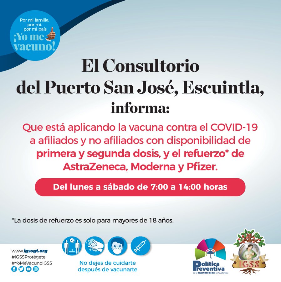 Aviso. El Consultorio del Puerto San José, Escuintla, informa: 18 enero, 2022 TwitterWhatsAppLinkedin El Consultorio del IGSS Puerto San José, Escuintla, le recuerda a la población en general qué pueden acudir a recibir la primera y segunda dosis de la vacuna contra el COVID-19. Además la dosis de refuerzo disponible para los mayores de 18 años.