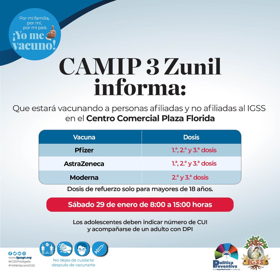 CAMIP Zunil  informa que aplicará vacunas AstraZeneca, Pfizer y Moderna a personas afiliadas y no afiliadas al IGSS en: