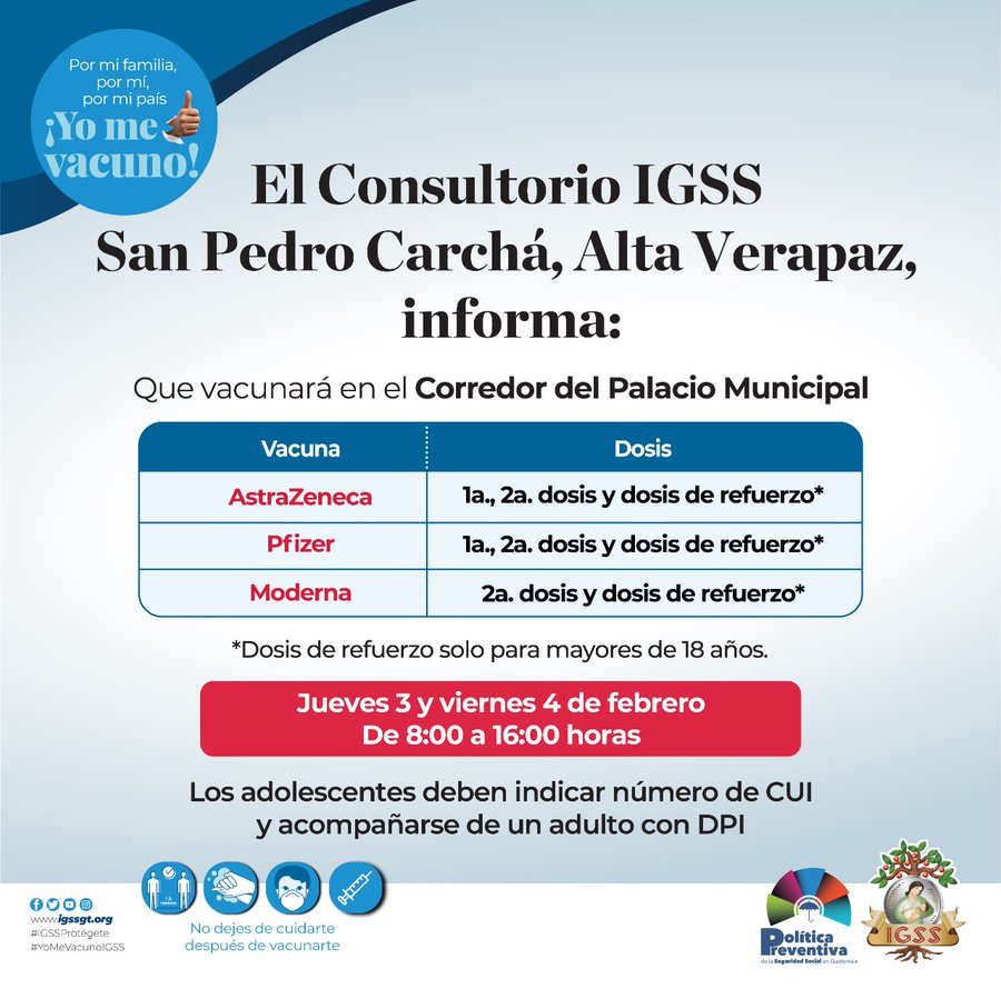 Aviso. El Consultorio IGSS San Pedro Carchá, Alta Verapaz, informa: 3 febrero, 2022 TwitterWhatsAppLinkedin El Consultorio IGSS San Pedro Carchá, Alta Verapaz, invita a la población acudir al Palacio de la Municipalidad de Carchá para recibir la vacuna contra el COVID-19. 3 y 4 de febrero De 8:00 a 16:00 horas Lleve DPI o proporcione el CUI del menor