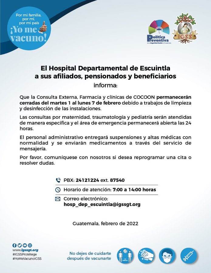 Aviso. El Hospital Departamental de Escuintla a sus afiliados, pensionados y beneficiarios informa: 3 febrero, 2022 TwitterWhatsAppLinkedin El Hospital Departamental de Escuintla informa del cierre de algunas áreas por trabajos de limpieza y desinfección de instalaciones del 1 al 7 de febrero de 2022. Para reprogramar cita o resolver dudas contáctenos. Atención de 7:00 a 14:00 horas