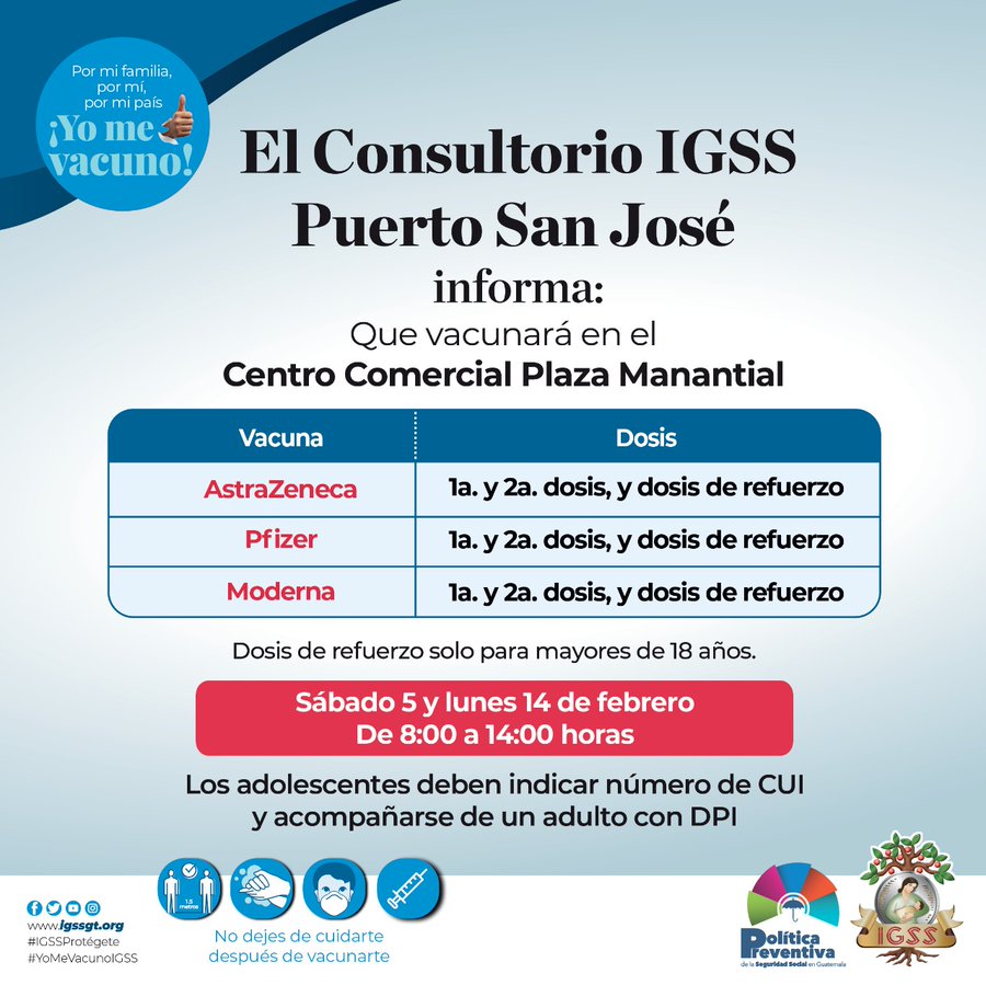 Aviso. El Consultorio IGSS Puerto San José informa: 4 febrero, 2022 TwitterWhatsAppLinkedin El Consultorio IGSS Puerto San José, Escuintla informa que este sábado 5 y lunes 14 de febrero administrará vacunas de las diferentes plataformas por medio de una brigada en el Centro Comercial Plaza Manantial. 8:00 a 14:00 horas