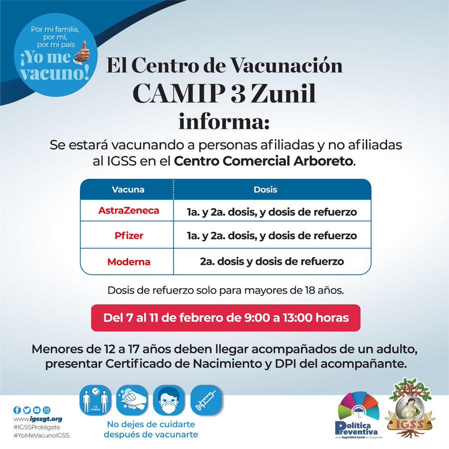 El Centro de Vacunación CAMIP 3 Zunil informa: 4 febrero, 2022 TwitterWhatsAppLinkedin El CAMIP 3 Zunil informa que estará administrando vacunas contra el COVID-19 a la población en general. C. C. Arboreto, San Nicolás, interconexión Boulevard El Naranjo-Minervas Del 7 al 11 de febrero De 9:00 a 13:00 horas Lleve DPI o CUI del menor