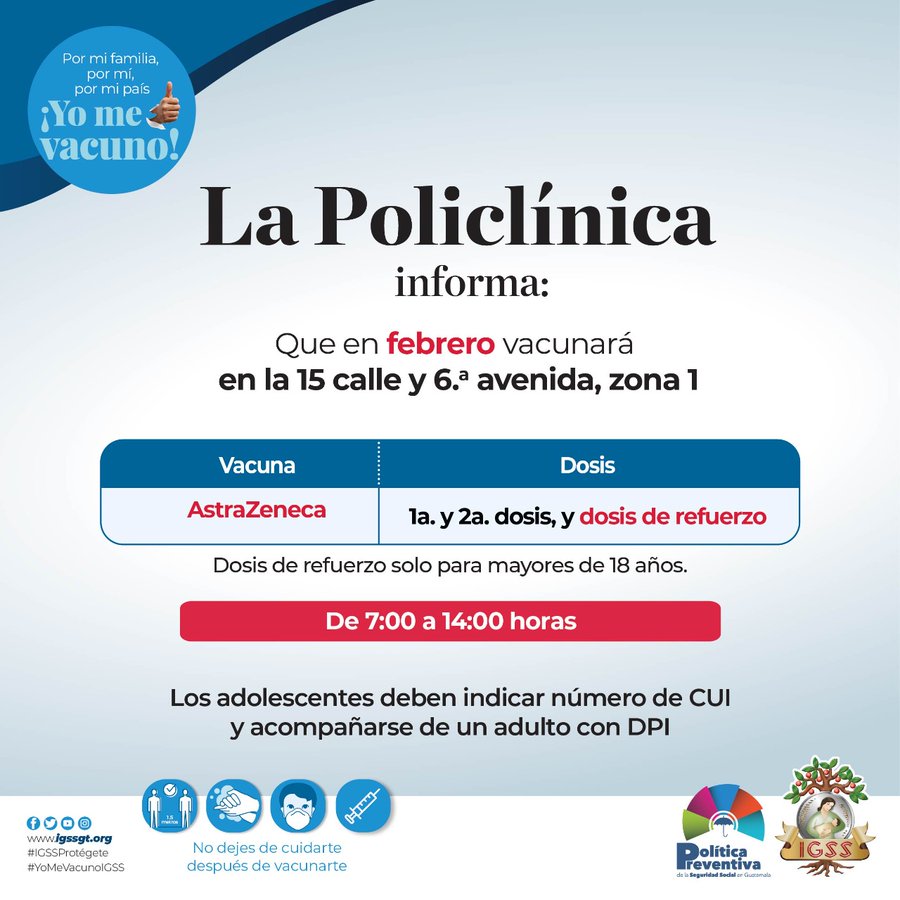 Aviso. La Policlínica informa: 9 febrero, 2022 TwitterWhatsAppLinkedin Una brigada de la Policlínica IGSS, zona 1, tendrá un puesto de vacunación contra el COVID-19 en el Paseo La Sexta del Centro Histórico capitalino. De 7:00 a 14:00 horas Lunes a viernes Población en general mayores de 18 años Lleve DPI