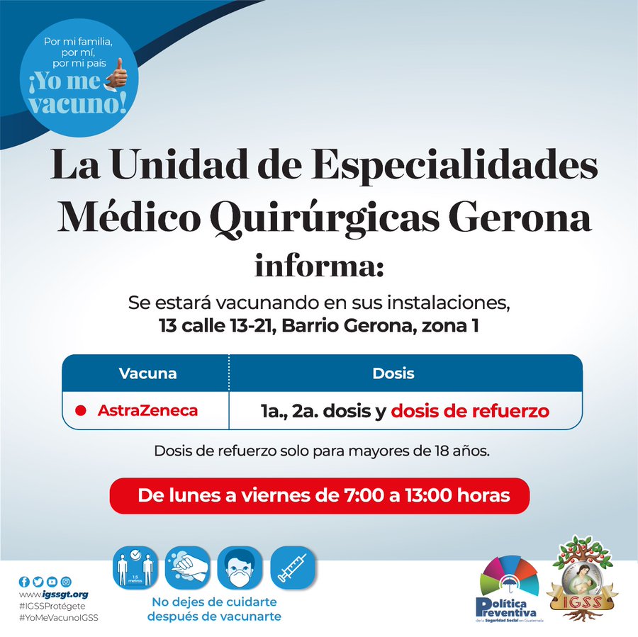 Aviso. La Unidad de Especialidades Médico Quirúrgicas Gerona informa: 9 febrero, 2022 TwitterWhatsAppLinkedin El IGSS habilita nuevo centro de vacunación contra el COVID-19 en la zona 1 capitalina. De lunes a viernes De 7:00 a 13:00 horas Población en general, mayores de 18 años Unidad de Especialidades Médico Quirúrgicas Gerona