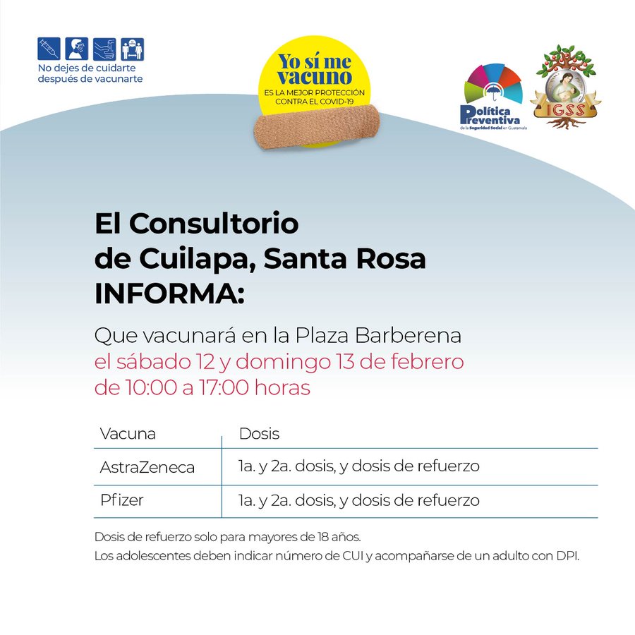Aviso. El Consultorio de Cuilapa, Santa Rosa INFORMA: 11 febrero, 2022 TwitterWhatsAppLinkedin El Consultorio IGSS Cuilapa, Santa Rosa, este sábado 12 y domingo 13 vacunará contra el COVID-19 en la Plaza Barberena. Población en general, mayor de 12 años Lleve DPI o Indique el CUI del menor Constancia de vacunación