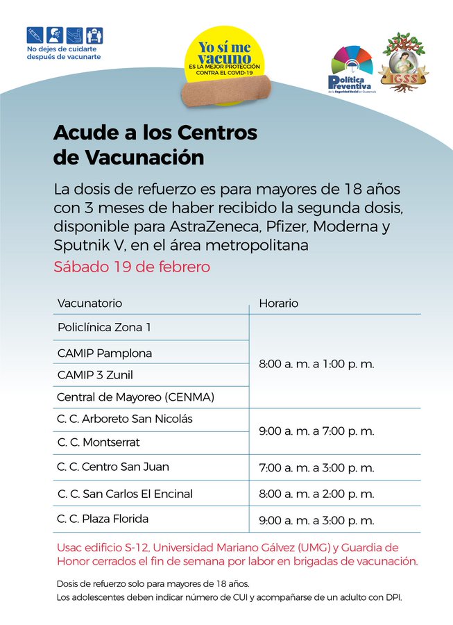 Aviso. Acude a los Centros de Vacunación 18 febrero, 2022 TwitterWhatsAppLinkedin El IGSS pone a disposición los siguientes centros de vacunación en el área metropolitana para mañana. Ver el horario de cada centro en la imagen. Refuerzo disponible para mayores de 18 años Se atiende a población en general