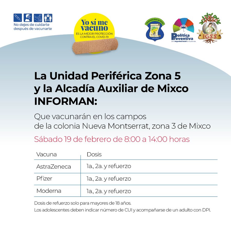 Aviso. La Unidad Periférica Zona 5 y la Alcaldía Auxiliar de Mixco INFORMA: 18 febrero, 2022 TwitterWhatsAppLinkedin Acuda a vacunarse este sábado 19 de febrero en los campos de Montserrat, zona 3 de Mixco. 8:00 a 14:00 horas Lleve DPI o indique el CUI del menor Constancia de vacunación
