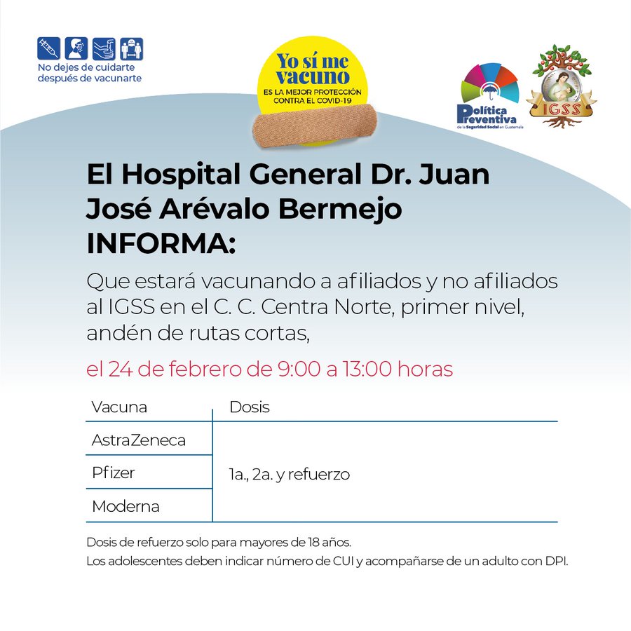 Aviso. El Hospital General Dr. Juan José Arévalo Bermejo INFORMA: 24 febrero, 2022 TwitterWhatsAppLinkedin Continúa la vacunación en el puesto de vacunación en Centra Norte, zona 18 capitalina. Cierre 13:00 horas Se atiende a población en general Lleve DPI o CUI del menor