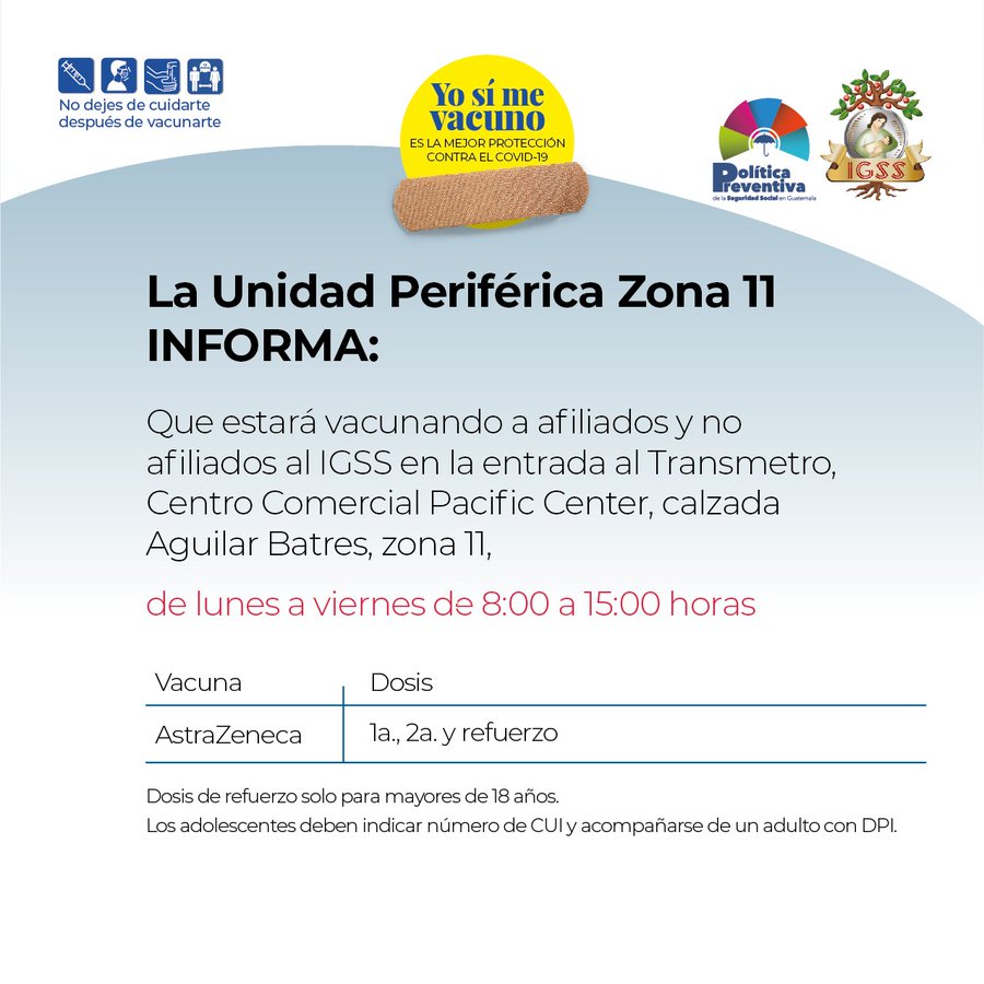 La Unidad Periférica Zona 11 tiene a disposición de afiliados o no afiliados, vacunas contra el COVID-19 en el Centro Comercial Pacific Center, zona 11.