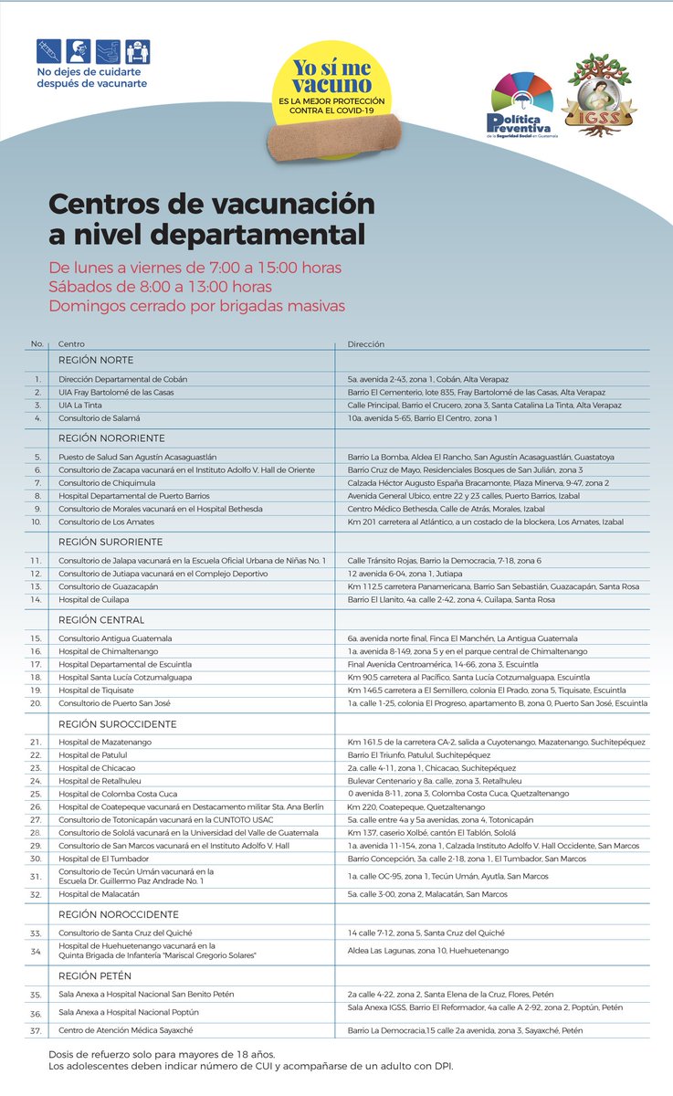 Aviso. Centros de vacunación a nivel departamental 4 marzo, 2022 TwitterWhatsAppLinkedin Conozca los centros de vacunación que el IGSS habilitará mañana en el ÁREA DEPARTAMENTAL. Lleve DPI o indique el CUI del menor Constancia de vacunación Se atenderá a la población en general 8:00 a 13:00 horas