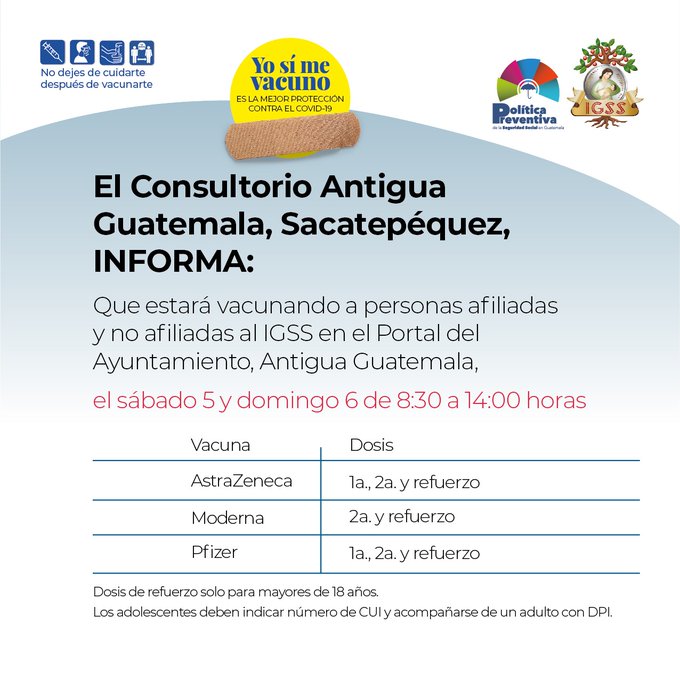 El Consultorio del IGSS Antigua Guatemala administrará en el Portal del Ayuntamiento dosis de AstraZeneca, Moderna o Pfizer a mayores de 12 años.
