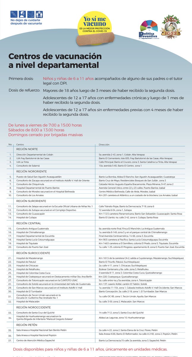 Aviso. Centros de vacunación a nivel departamental 18 marzo, 2022 TwitterWhatsAppLinkedin Centros de vacunación del IGSS habilitados en el ÁREA DEPARTAMENTAL. Lleve DPI o Indique el CUI del menor y Constancia de vacunación Atención a afiliados y no afiliados 8:00 a 13:00 horas 1a. dosis a mayores de 6 años