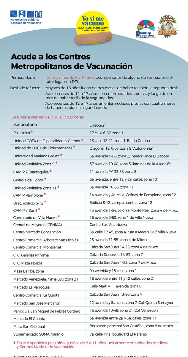 Aviso. Acude a los Centros Metropolitanos de Vacunación 25 marzo, 2022 TwitterWhatsAppLinkedin Acuda a vacunarse a los centros metropolitanos del IGSS: Lleve DPI Registro: http://vacuna.gob.gt Constancia de vacunación Refuerzo para mayores de 12 años Afiliados y no afiliados Ver disponibilidad en aviso para niños de 6 a 11 años