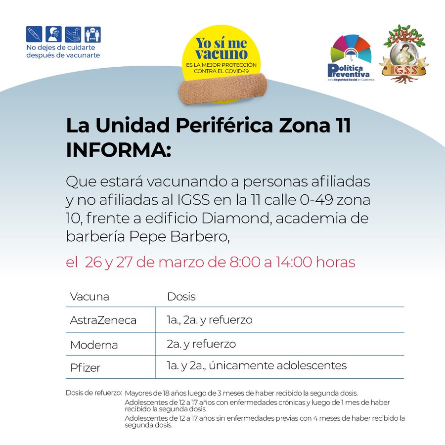 Aviso. La Unidad Periférica Zona 11 INFORMA: 25 marzo, 2022 TwitterWhatsAppLinkedin Al público en general que administrará vacunas contra el COVID-19 en la 11 calle 0-49 zona 10 frente al edificio Diamond, academia de barbería Pepe Barbero este sábado y domingo. 8:00 a 14:00 horas.