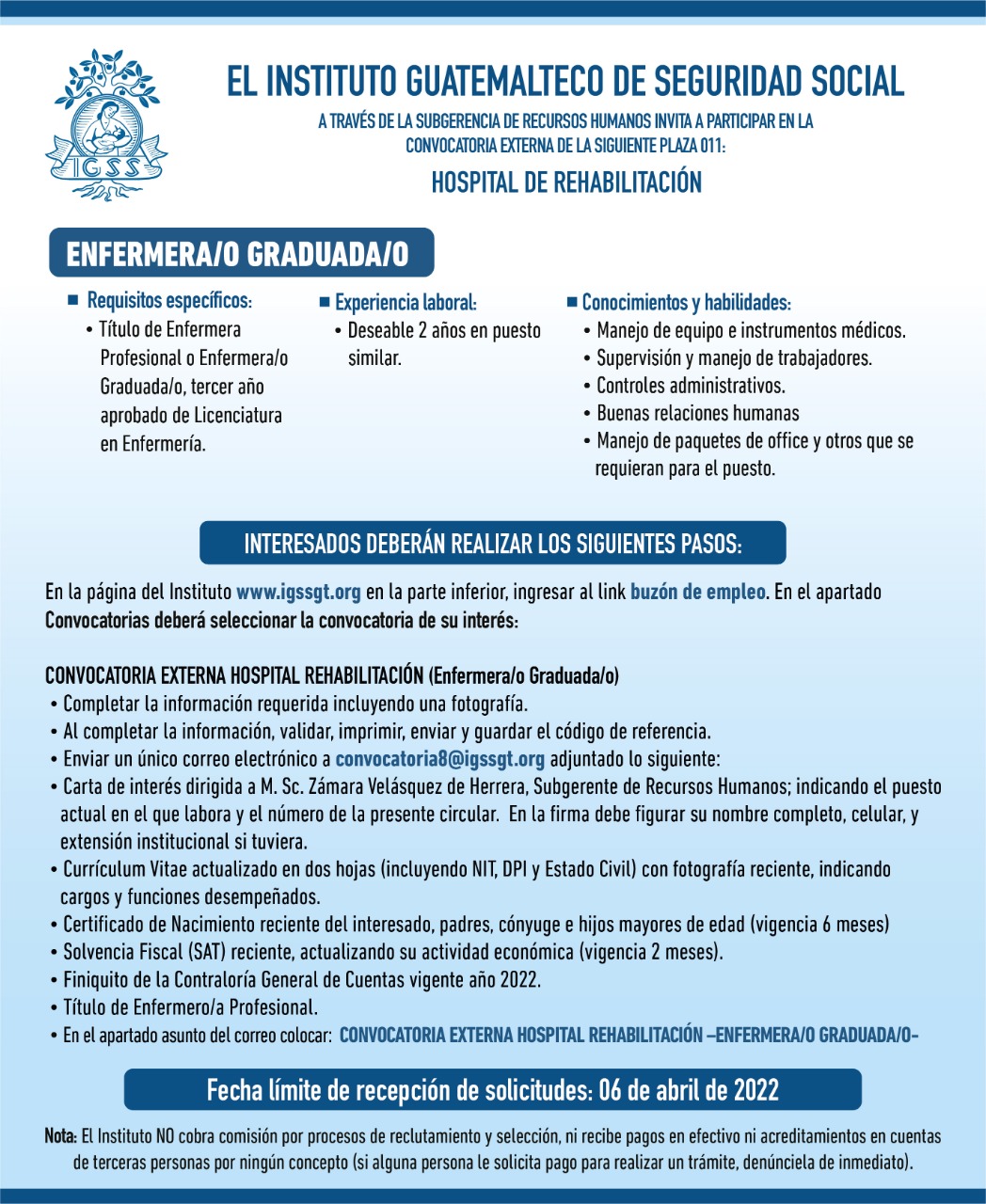 El IGSS invita a participar en la convocatoria para la plaza: Enfermera/o Graduada/o 31 marzo, 2022 TwitterWhatsAppLinkedin Para el Hospital de Rehabilitación Fecha límite de recepción de solicitudes: 06 de abril de 2022