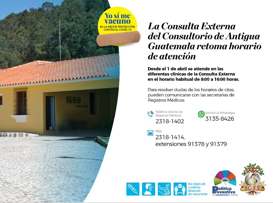 Aviso. La Consulta Externa del Consultorio de Antigua Guatemala retoma horario de atención informa: 7 abril, 2022 TwitterWhatsAppLinkedin El Consultorio IGSS de Antigua Guatemala informa que retomó la atención en las clínicas de la Consulta Externa a partir del 1 de abril en el horario habitual. 8:00 a 16:00 horas