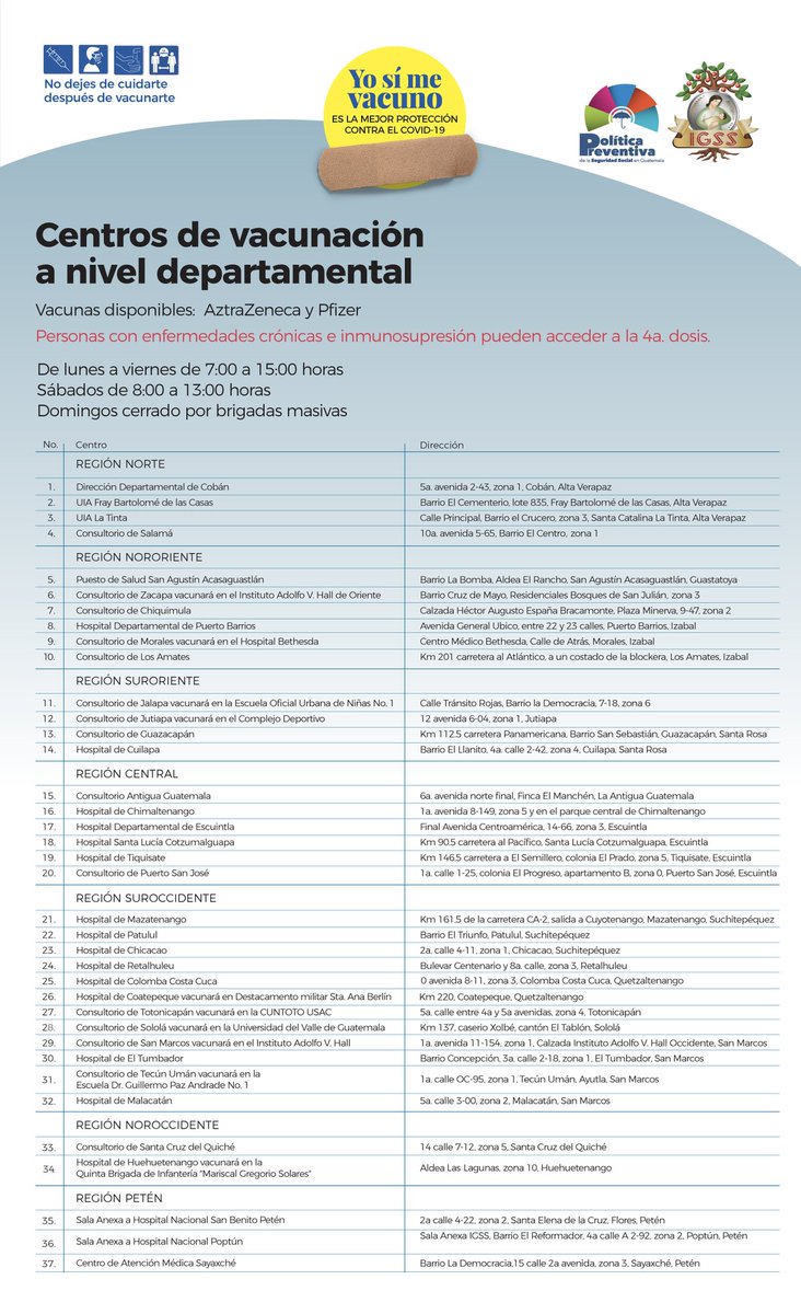 Centros departamentales de vacunación del IGSS disponibles para la población en general.