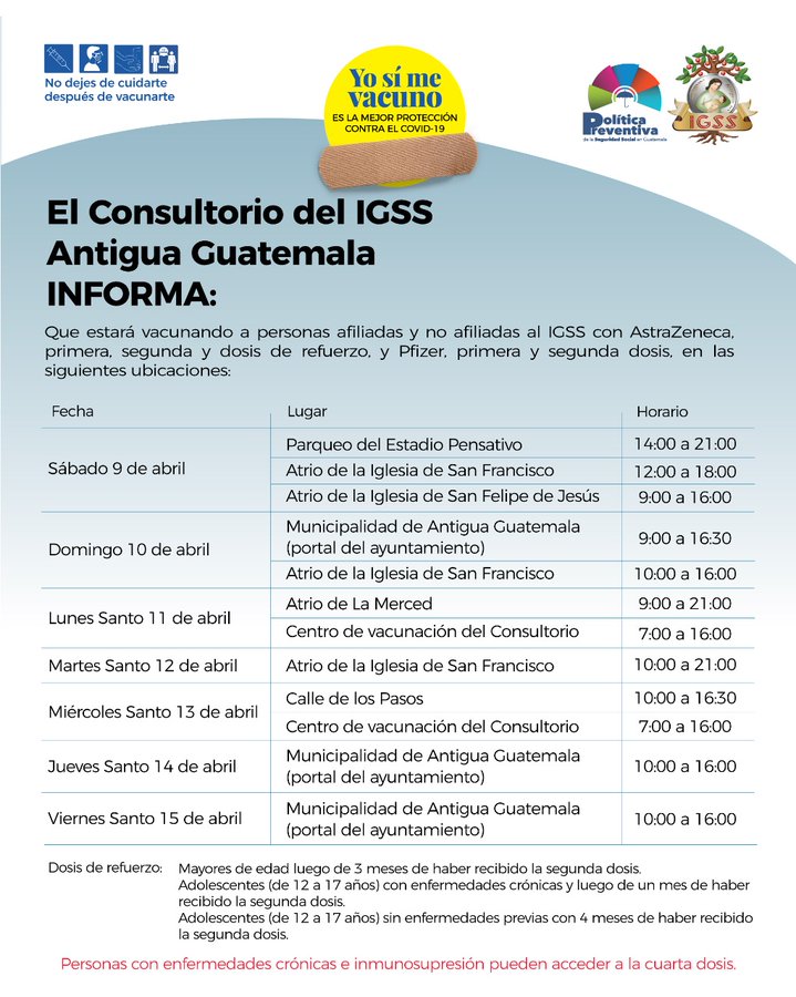 Aviso. El Consultorio IGSS de Antigua Guatemala INFORMA: 9 abril, 2022 TwitterWhatsAppLinkedin El Consultorio IGSS de Antigua Guatemala esta Semana Santa pone a disposición de la población en general varios puestos de vacunación. ACLARACIÓN: El puesto de la Municipalidad se ubicará en el atrio de la Catedral.
