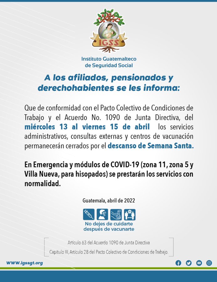 Aviso. A los afiliados, pensionados y derechohabientes se les informa: 12 abril, 2022 TwitterWhatsAppLinkedin El IGSS informa sobre el cierre de los servicios administrativos, consultas externas y centros de vacunación a nivel nacional, con motivo del descanso de Semana Santa.