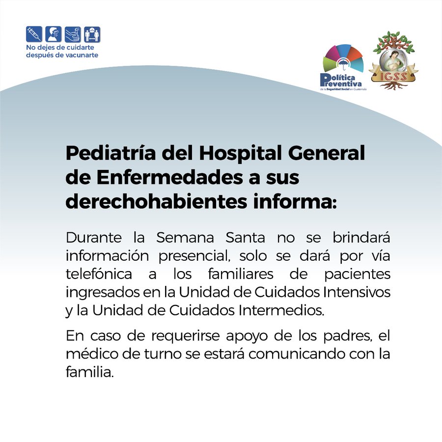 La Pediatría del Hospital General de Enfermedades, zona 9 informa que durante la Semana Santa se brindará información a los familiares de los pacientes ingresados únicamente por vía telefónica.