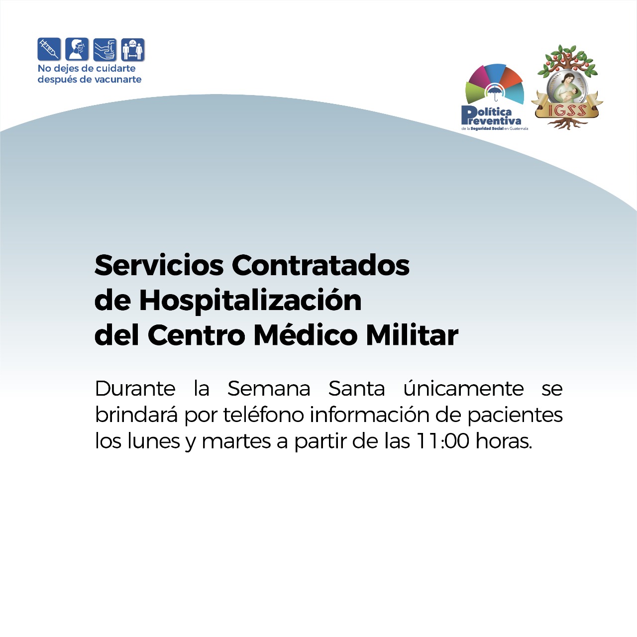 Aviso. Servicios Contratados de Hospitalización del Centro Médico Militar informa: 13 abril, 2022 TwitterWhatsAppLinkedin La información a los familiares de pacientes ingresados en los Servicios Contratados de Hospitalización del Centro Médico Militar se brindará únicamente los lunes y martes a partir de las 11:00 horas.