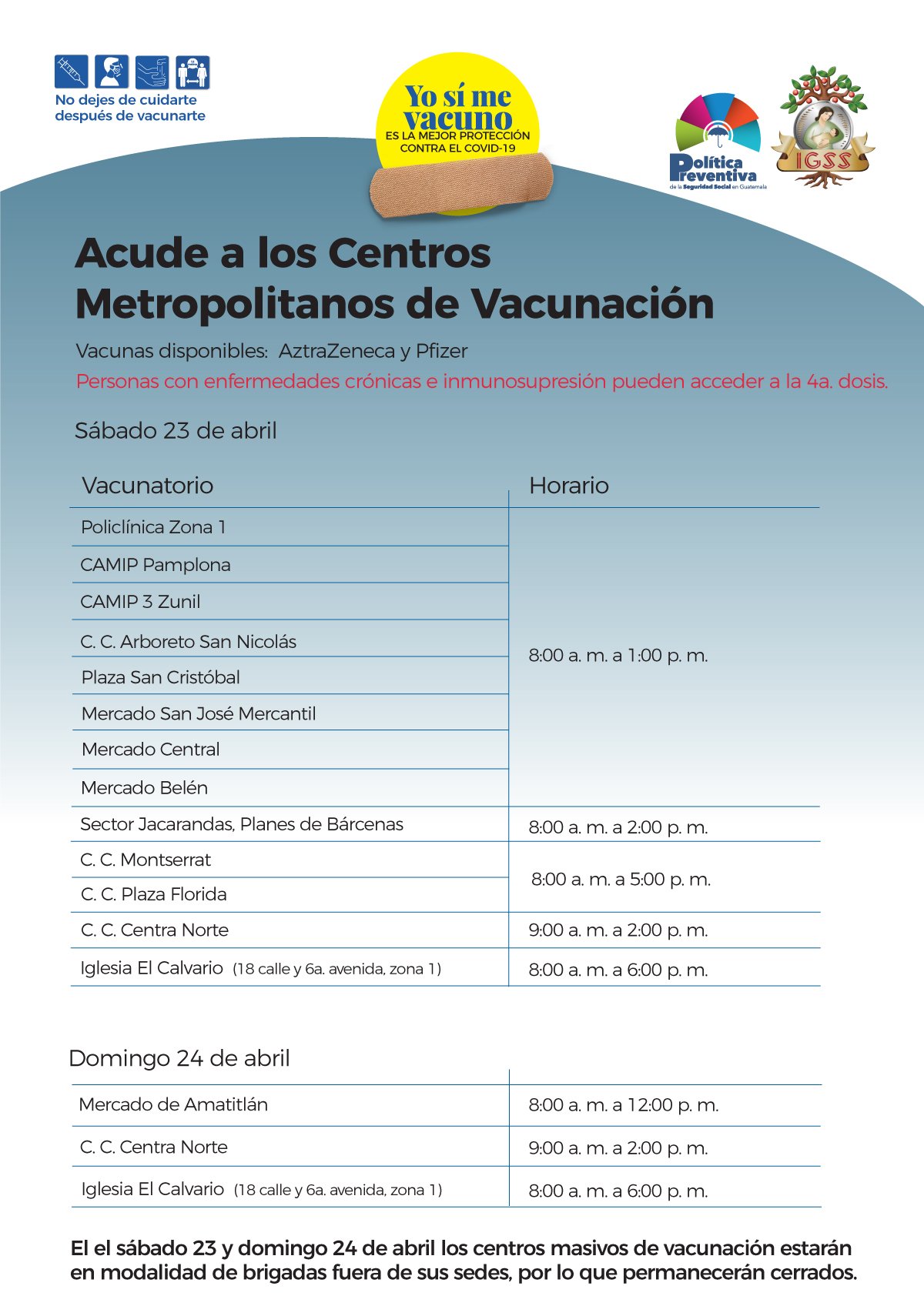 Aviso. Acude a los Centros Metropolitanos de Vacunación 24 abril, 2022 TwitterWhatsAppLinkedin Acuda a vacunarse este domingo, el IGSS dispone de tres centros en el área metropolitana para la población en general. Lleve DPI o indique el CUI del menor