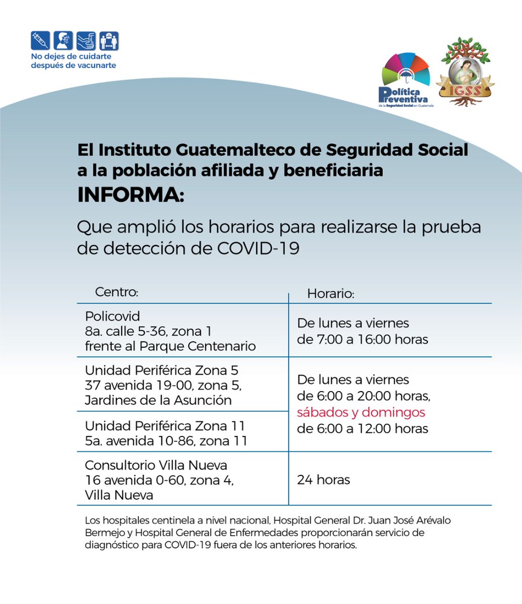 Aviso. El Instituto Guatemalteco de Seguridad Social a la población afiliada y beneficiaria INFORMA: 23 mayo, 2022 TwitterWhatsAppLinkedin A los afiliados, pensionados y beneficiarios se les informa el horario de atención para realizar las pruebas de detección de COVID-19.