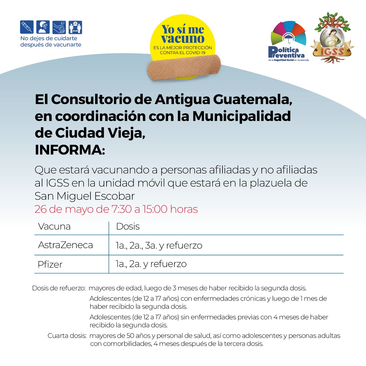 Aviso. El Consultorio de Antigua Guatemala, en coordinación con la Municipalidad de Ciudad Vieja, INFORMA: 26 mayo, 2022 TwitterWhatsAppLinkedin Se estará vacunando a personas afiliadas y no afiliadas al IGSS en la unidad móvil ubicada en la plazuela de San Miguel Escobar. 26 de Mayo De 7:30 a 15:00 horas