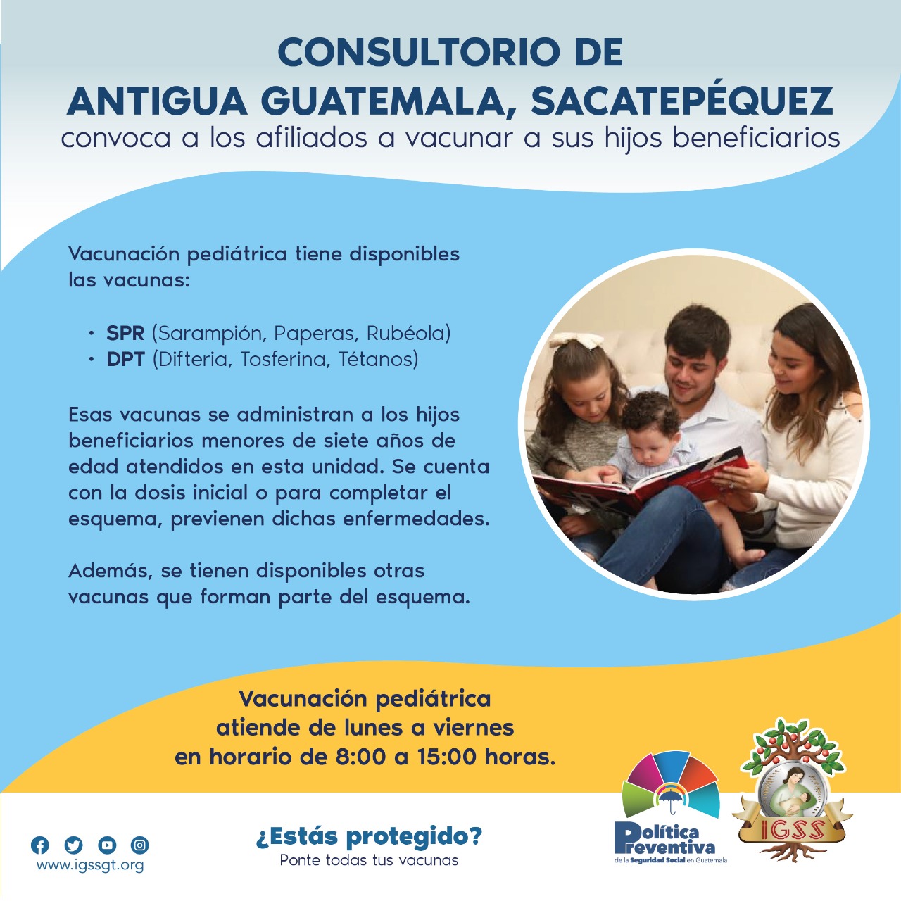 Aviso. Consultorio de Antigua Guatemala, Sacatepéquez convoca a los afiliados a vacunar a sus hijos beneficiarios 2 junio, 2022 TwitterWhatsAppLinkedin El Consultorio de Antigua Guatemala, Sacatepéquez, informa que tiene disponibles vacunas para los hijos de los afiliados menores de 7 años. SPR (Sarampión, Paperas, Rubéola) DPT (Difteria, tosferina, Tétanos) Lunes a viernes 8:00 a 15:00 horas