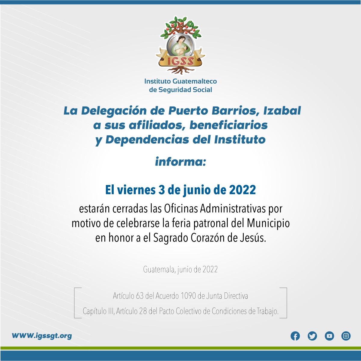 Aviso. La Delegación de Puerto Barrios, Izabal, a sus afiliados, beneficiarios y Dependencias del Instituto informa: