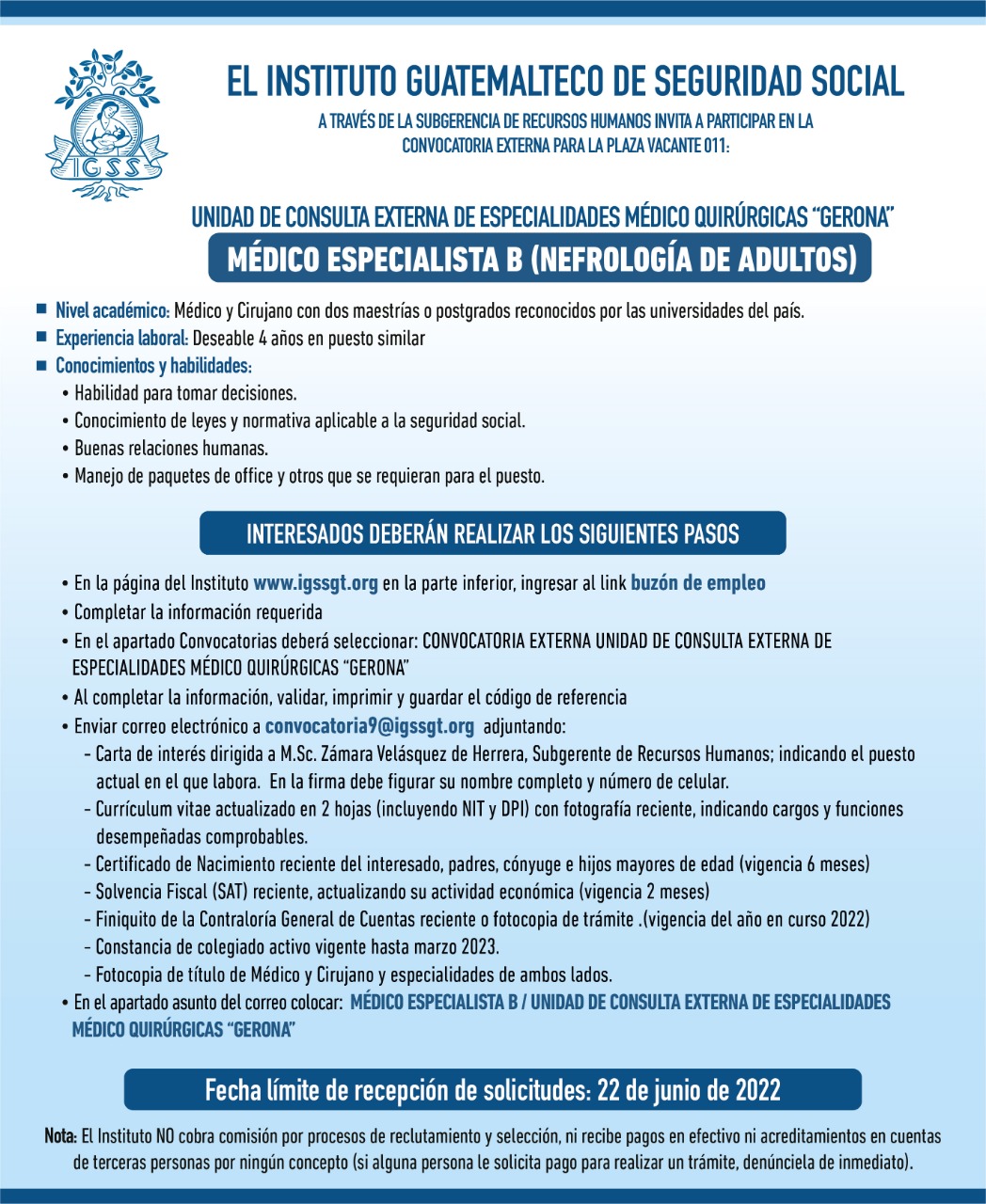 El IGSS invita a participar en la convocatoria de la plaza: Médico Especialista B (Nefrología de Adultos)