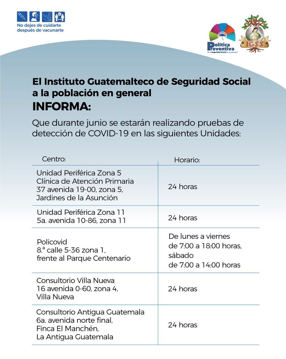 Aviso. El Instituto Guatemalteco de Seguridad Social a la población en general INFORMA: 20 junio, 2022 TwitterWhatsAppLinkedin Durante junio se realizarán pruebas de detección de COVID-19 en las siguientes unidades médicas.